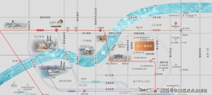 滨江潮颂府的地段价值堪称"王炸级"配置。项目与地铁1号线南阳站直线距离仅约300米,形成"地铁口+大会展"的黄金组合。从南阳站出发,往南2站即达萧山国际机场,无缝换乘7号线、19号线;往北3站到达下沙核心商圈。