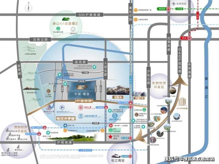 3【名校林立】:南面,仅一路之隔便是松江大学城,7大顶级学府高校为邻;上外云间、华东政法大学附属学校、上外松外等优质学校在旁。赫德双语、包玉刚实验学校、上外西外等高端私立提供双语教育选择。(期房不承诺和划分学区)