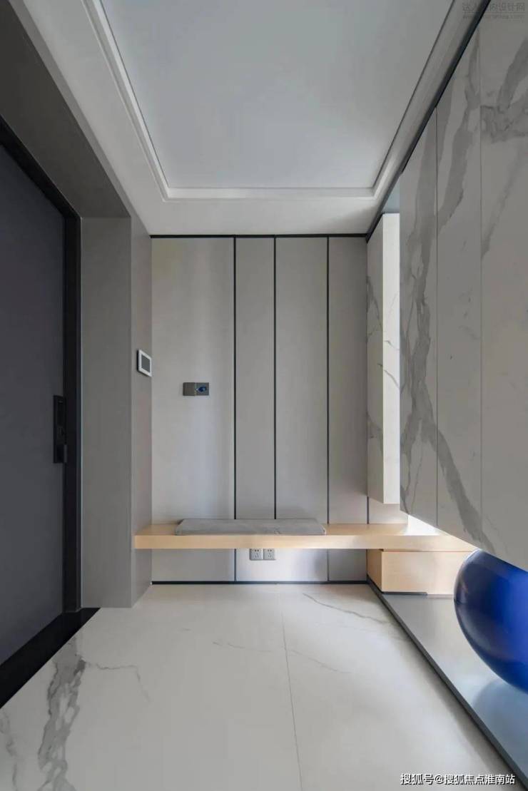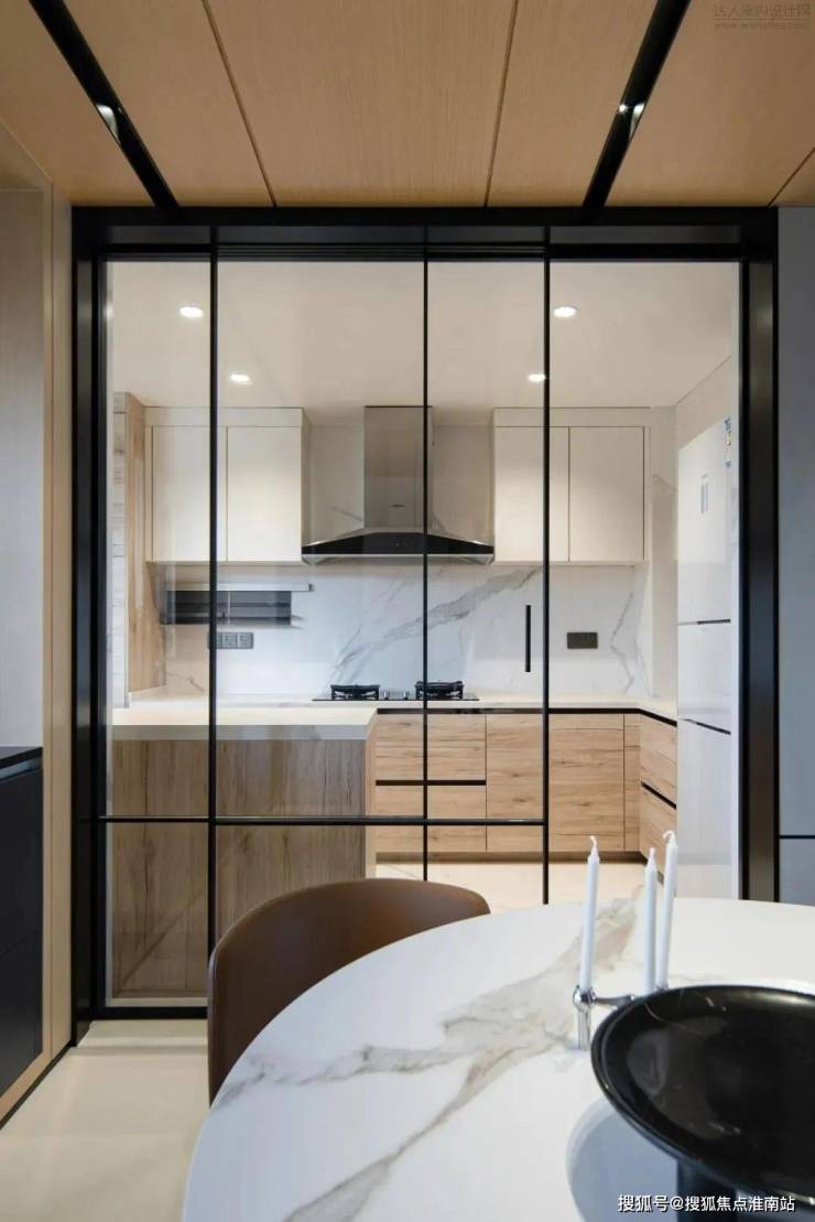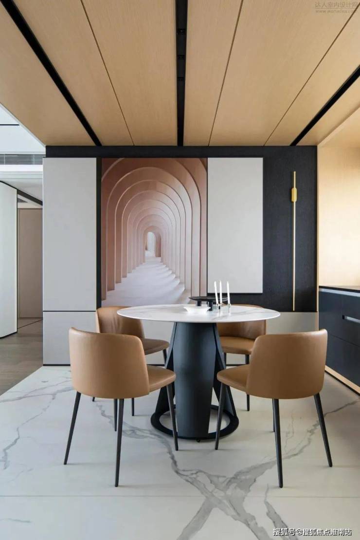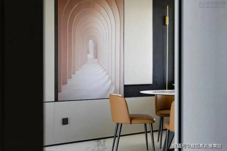 餐厅绝佳的整体性从腰线背景延续到走道可以看出,门的处理方式不到顶,但是和上面的分色统一到餐厅,这样不会觉得闷,层次又比较丰富。