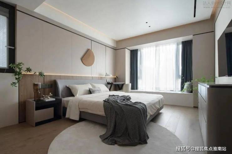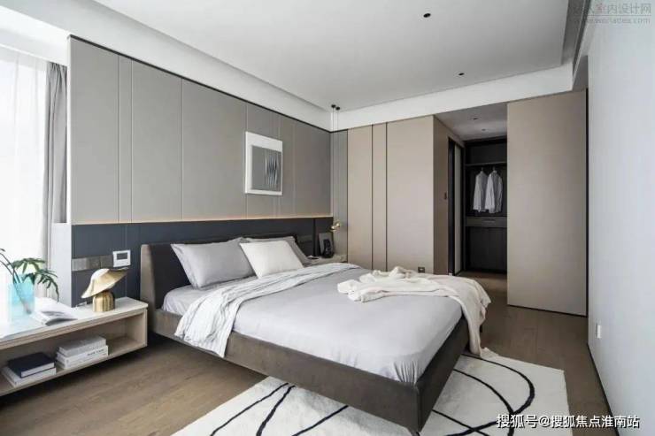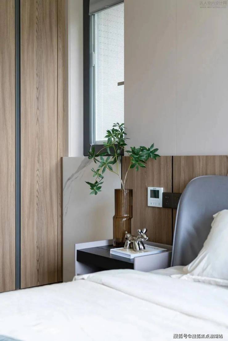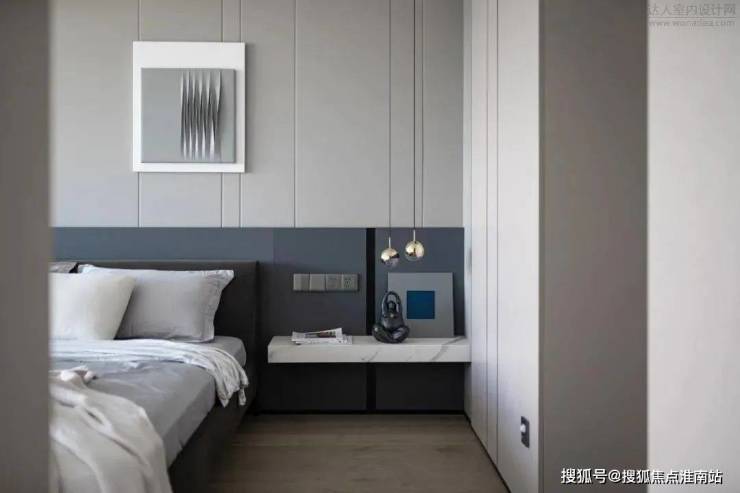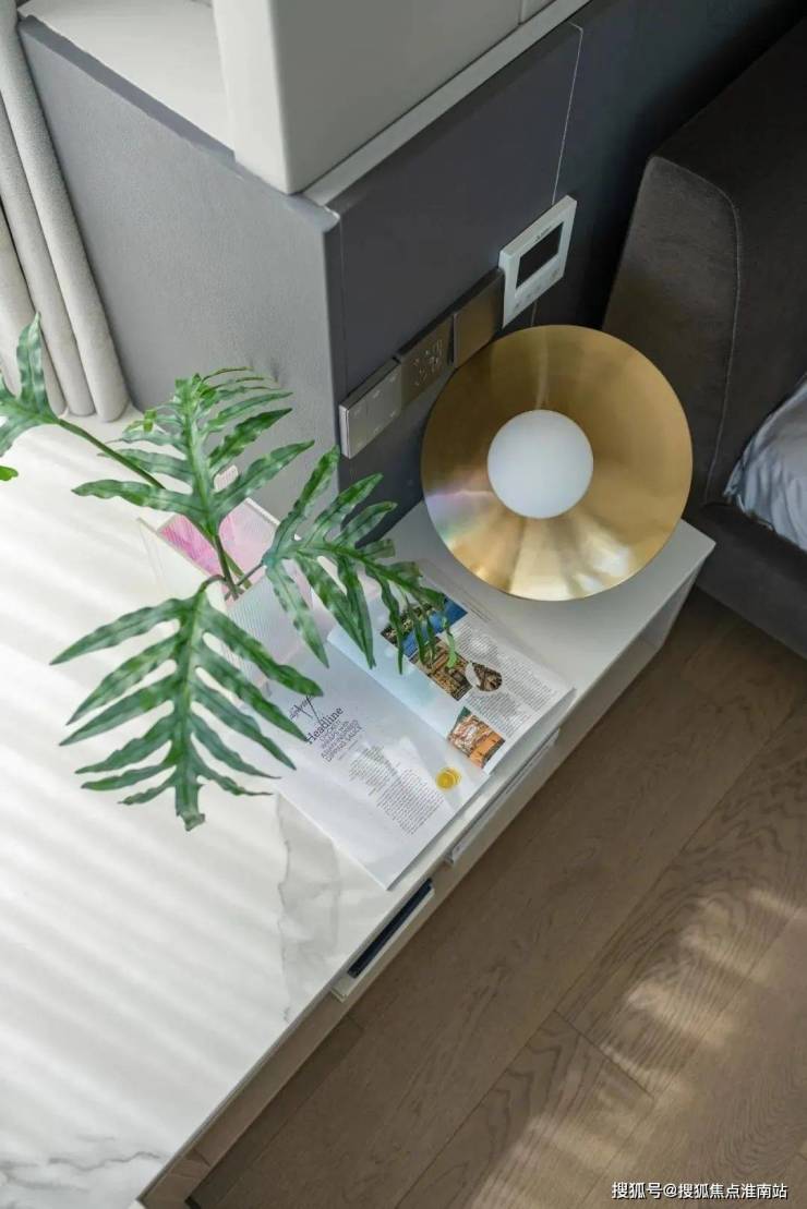 主卧整体比较素净有质感。L型的窗台带来绝佳的采光,两侧的床头柜一侧由窗台延伸而出,一侧由墙体蔓延,搭配简约的吊灯与金属感的台灯,碰撞出的不规则美感。