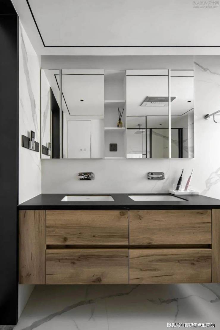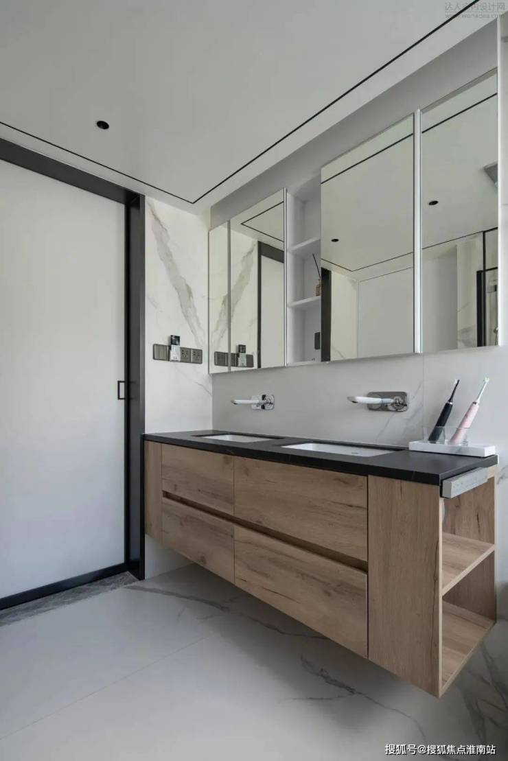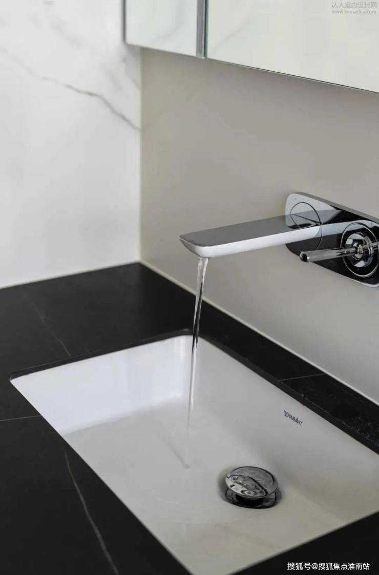 客卫也是由黑白的岩板通铺地面延伸至墙面,彰显低调的高级。洗手台挨着马桶一侧设置了开放的储物格,视觉上更加简洁,使用感也更佳。
