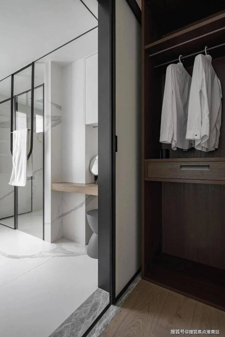 主卧设置了双衣帽间,通向主卫外侧设置了一个稍小型衣帽间,是男屋主专用,女屋主的衣帽间在床尾,储存量更大,看着美美的衣服整整齐齐的摆放在一起,心情都会更加美丽