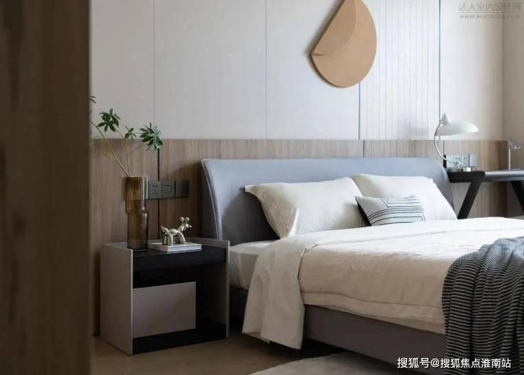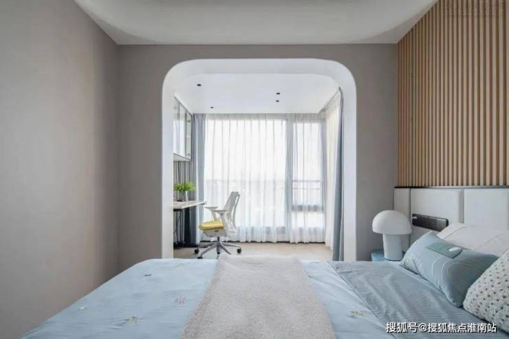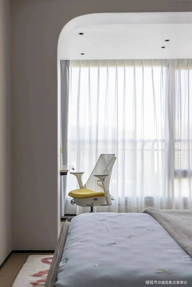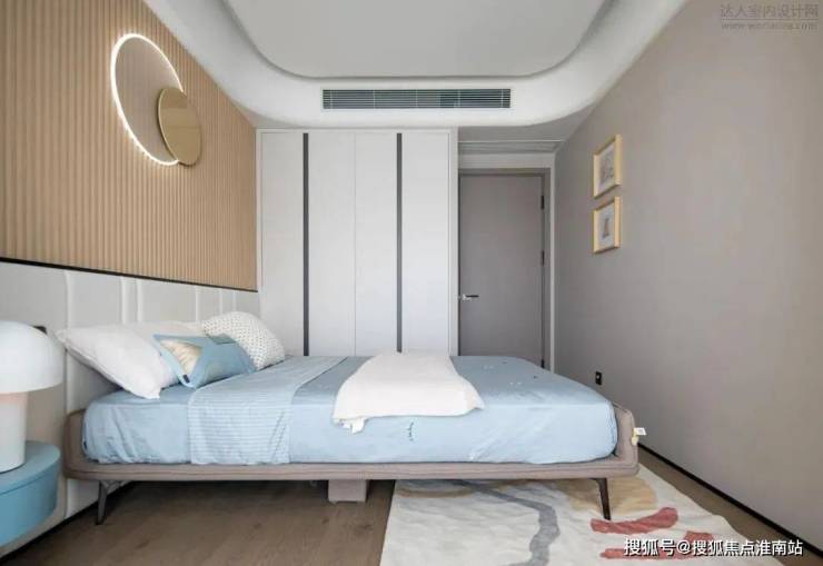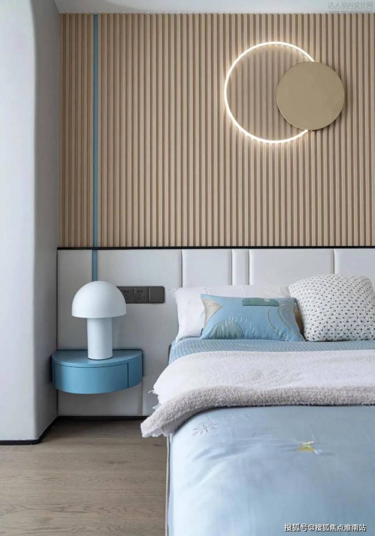 儿童房床头是硬包+长城板的组合,圆形的装饰灯与蘑菇灯弱化了生冷的线条感,以局部的蓝色作为点缀,彰显童趣。四件套可根据日后小朋友的喜好更换,无需变动硬装,相对更加节约成本。