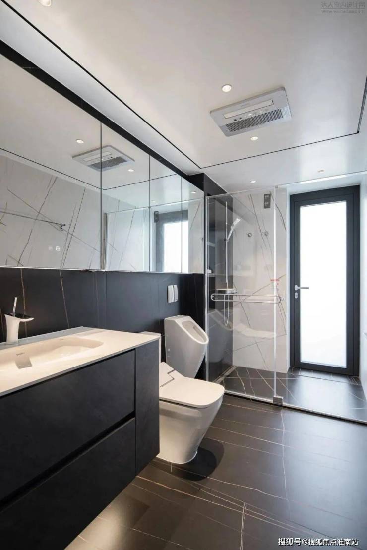 客卫使用黑白灰的经典配色,整排的镜柜增加收纳。相对于常规的卫生间三件套,多加了一个小便斗,更加方便干净些,也更实用。淋浴间连接生活阳台,玻璃门的设置也给客卫补足了采光。