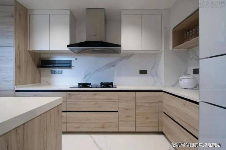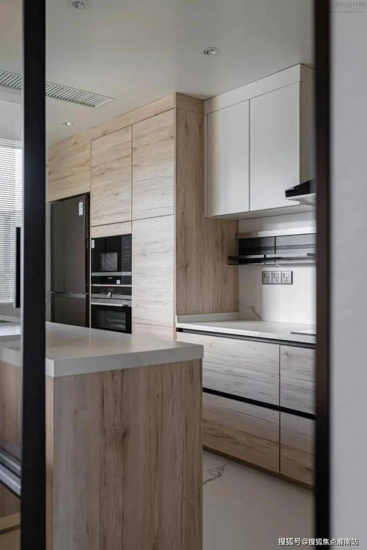 厨房整体以实木与岩板为主,岩板通铺地面延伸至墙面,实木缓和了岩板带来的冷冽。L型的厨房储物与操作台面本已足够,在格局优化的情况下多加了一个操作台面,可容纳多人下厨,也足够收纳屋主家一年四季的柴米油盐酱醋茶。