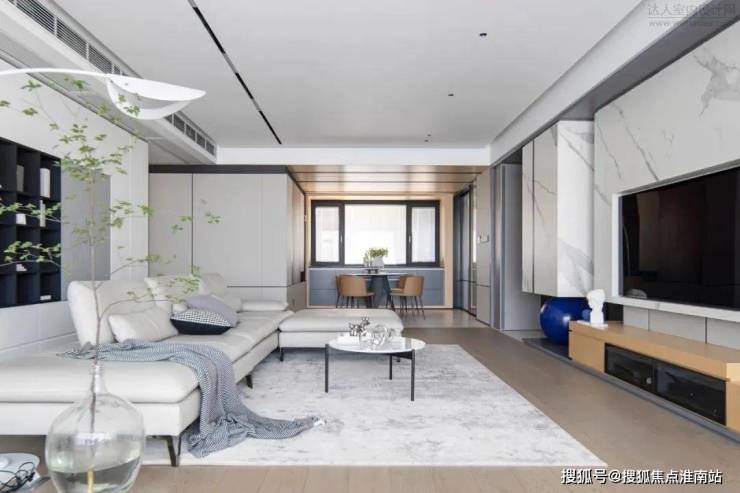 电视背景墙由木饰面+拉米娜连纹岩板连接玄关的柱体组成,所以整体性更佳。下方的电视柜更是连接了玄关处的换鞋凳,两个空间独立并产生联系。