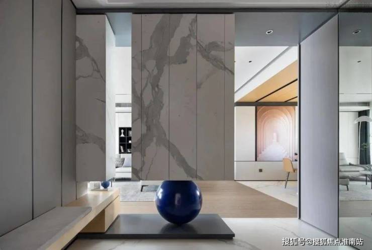 进门玄关,利用建筑中的盒子手法来做设计,鞋柜旁特意留了空隙,让视觉可以穿透至客厅,给空间增加了趣味以及灵活性。从天而降的岩板几何柱体若是做成顶天立地的造型会减弱通透的效果,利用圆体作为支撑,将数学美学诠释得到位且惊艳!玄关镜处一整面墙的柜体与几何柱体支撑了强大的收纳,线条简洁更是无需多余的装饰。