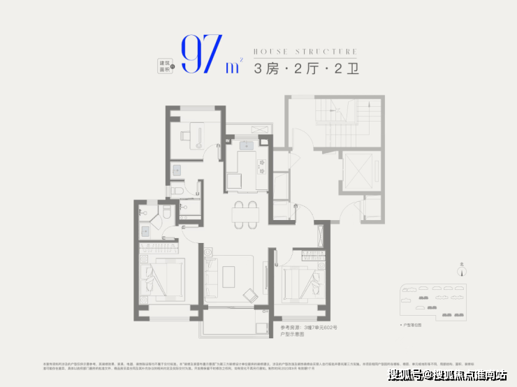 建面约97㎡3房2卫,升级版大3房,入户玄关+主卧套房设计,整体私密性更强,空间更为宽敞。