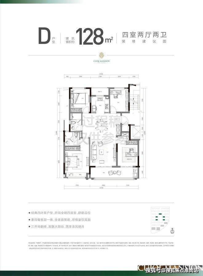 建面约128方采用了深受市场认可的经典的四叶草格局!这种户型的显著特点,就是消灭过道。客厅居于房子的中心,可以直接到达卧室、书房、厨房等各个空间。另外,4个功能间居于四角,对私密性的维护也和当下社会注重隐私的需求不谋而合,即使是孩子、长辈同住,也能有一个很好的家庭秩序。