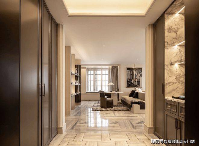 万科中兴傲舍官方售楼处电话:400-8818-994【预约☎】进入室内的入户玄关收纳空间,地面采用静雅棕、宝格丽兰石材拼花设计,古典回形波打+实心铜条的搭配增强入户尊贵感。右侧是山水白奢石的开放格,左侧是行李间,通过暗门的做法,将功能结合进去,强化了归家的仪式感。