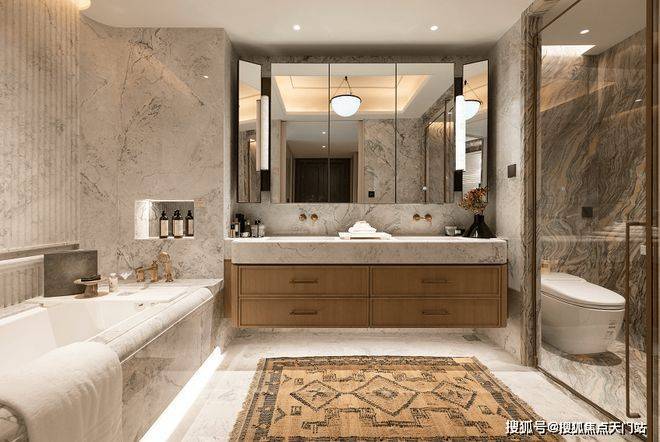 万科中兴傲舍官方售楼处电话:400-8818-994【预约☎】正对玄关的位置是主卫,地面墙面为巴西鱼肚灰,淋浴间为水云纱。五金品牌为GESSI,浴缸及智能马桶品牌为劳芬,定制镜柜里面配有美妆冰箱。