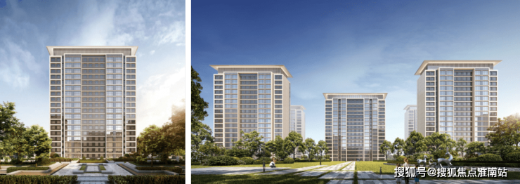 外立面采用经典时尚现代主义风格:通过温和的色彩搭配、简练的横向线条、黄金比例的立面比例、极简抽象的建筑符号、建筑顶部的飘板,呈现一个现代风格和艺术气质结合的高品质社区。