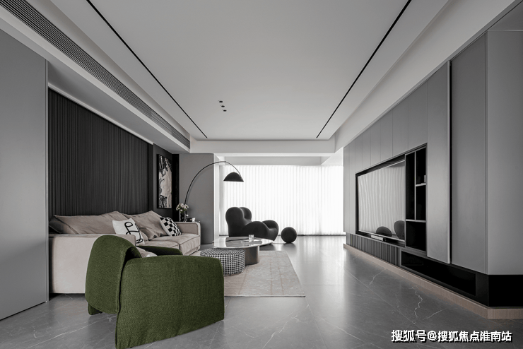 The open layout throughout the design has thrown away the shackles of traditional closure, so that each functional area naturally integrates with each other. Black shaped sofa like a dynamic melody, injected the vitality of the space, its many convex design, but also fit the body curve, for the residents to bring comfortable experience.