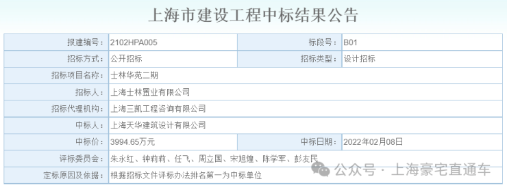 2022年2月8日,上海天华建筑设计有限公司以3994.65万元中标士林华苑二期地块设计项目!