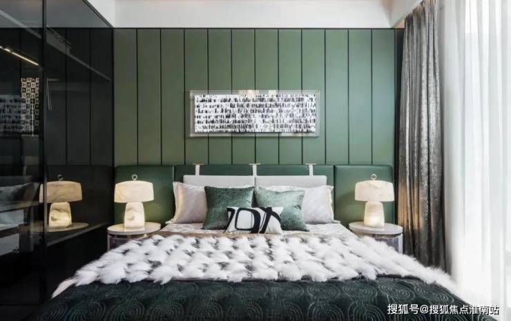 床头的背景墙设计巧妙而独特,皮料的柔软触感与金属的冷硬质感相互碰撞,形成了一种既现代又古典的美学风格,既展现了业主的非凡品味,又彰显出一种无法言喻的贵气。它们不仅提升了整个居住空间的品质感,更让业主在日常生活中能够感受到一种高品质的生活体验。