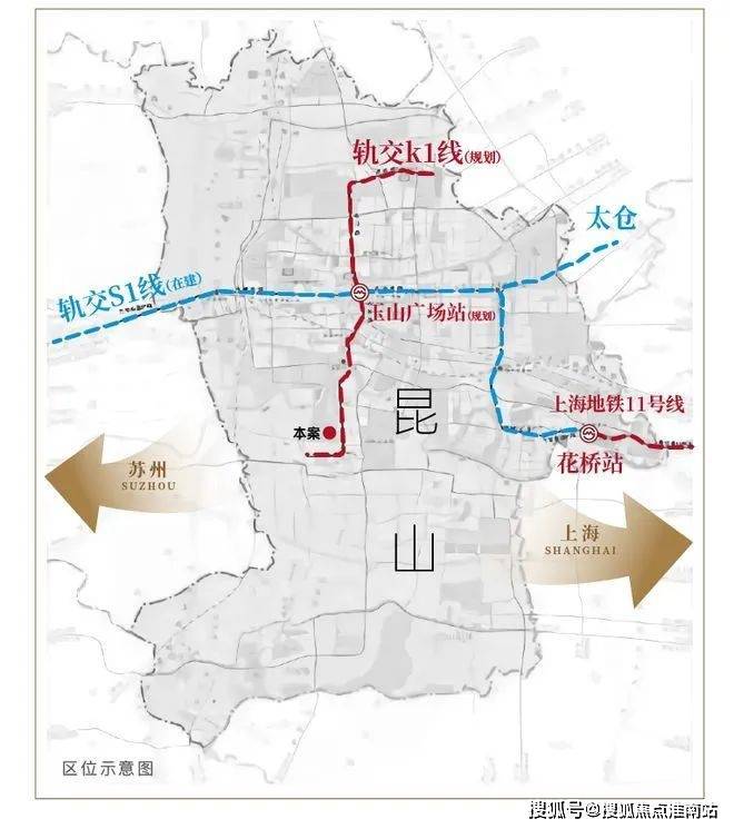 配套设施:【交通】项目距离高铁昆山南站直线距离仅约6公里,规划中的K1线,预计将从项目东侧经过,成为联通南北的轨道交通主干线。K1线未来将在玉山广场站与S1线换乘(规划),可抵达苏州、上海等地,真正实现“三地同城化”。