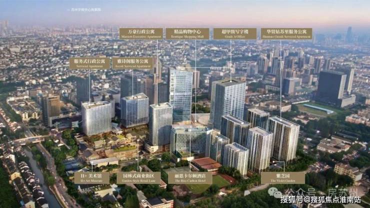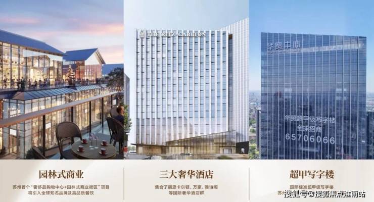 苏州华贸中心择址苏州姑苏区核芯,约78万方地铁上盖城市综合体,规划超甲级写字楼、精品购物中心、园林式商业街区、丽思卡尔顿酒店、万豪行政公寓、雅诗阁服务公寓、华贸姑苏里服务公寓、H+美术馆、紫芝园等多元业态,充分融合东方历史文化与大都市商业文明的精髓,致力于打造全新的江南大都会生活方式。