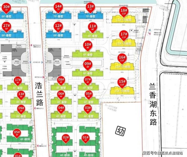 小高层楼间距约30米,联排楼间距约12.84~13米,4F鲁墅楼间距约16.3~22米,6-7F叠墅楼间距约20.1米左右!