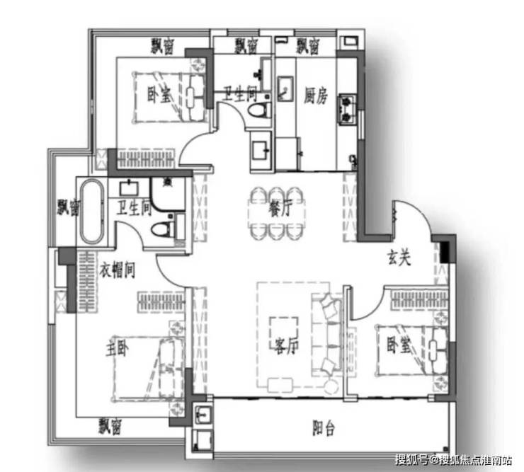一梯两户设计,户型三开间朝南,客厅面宽约4.5米,边套主卧和北卧均为270°转角飘窗。