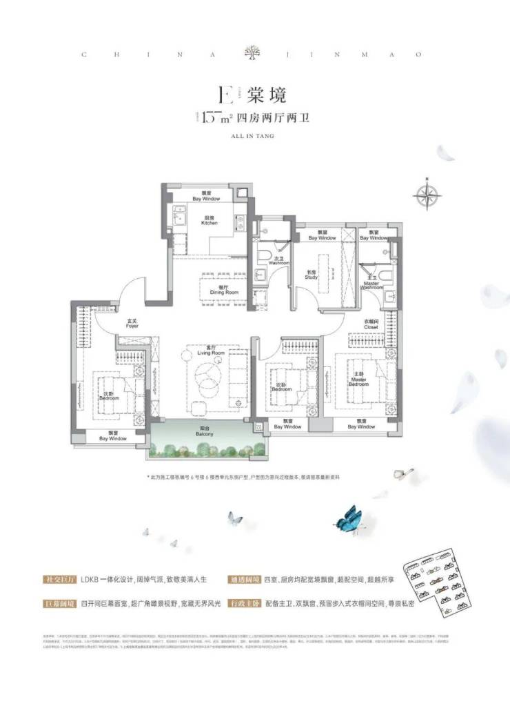 建面约137、152㎡4房2厅2卫,空间布局非常相似,都做到了四开间朝南+入户玄关+6个飘窗+主卧套房设计,所有空间的尺度一步到位。