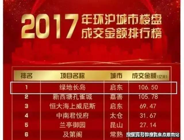 2017年绿地长岛以成交金额突破百亿的优势成绩分列全国第二,环沪第一。