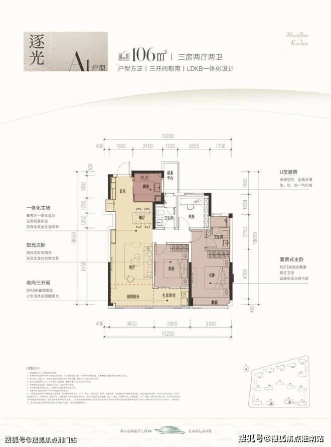 滨江时舟里售楼处电话➡:400-8818-994(售楼中心电话建筑面积约106㎡A1户型,户型方正,三开间朝南+LDKB一体化设计,基本没什么浪费面积。虽然是中间套设计,但做到了全明户型,通风效果好,可以说杭州少见。