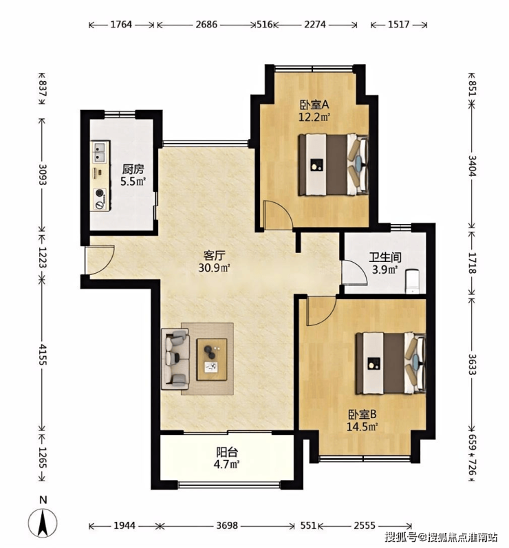 两房 约89.36㎡ 南北通透户型