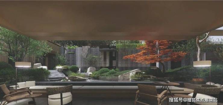 中央水韵庭院以「叠水莲池」为理念打造多层次的水景体系,叠水瀑布形成动态的水流韵律,池畔大理石打造的休憩长桌,成为被绿意环抱的林下空间,氛围相当惬意~