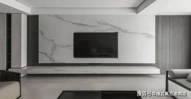 电视墙很长,用石材+护墙板做分段装饰,简单、有质感。