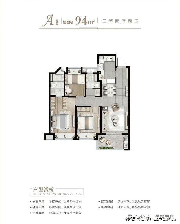 通过简洁的线条勾勒出清晰的建筑轮廓,通透的玻璃面展现出建筑的轻盈之姿,类公建化的立面形象呈现端庄典雅的气度