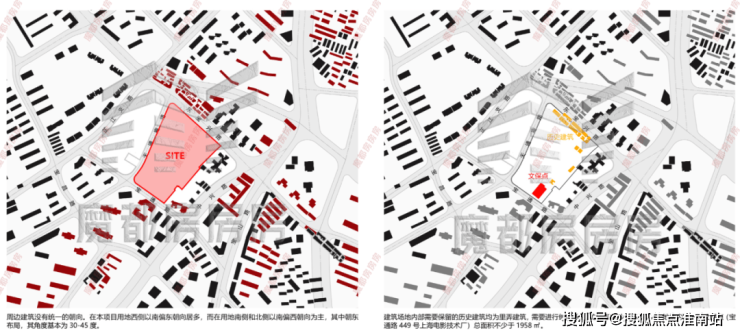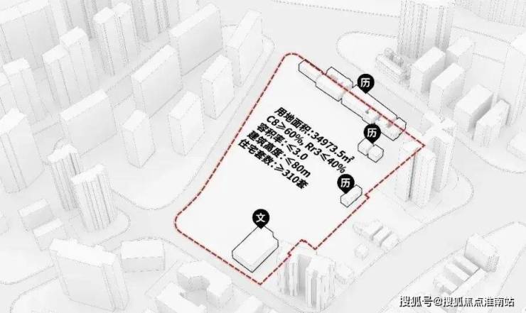 基地内需设置两栋办公楼、三栋商品住宅、一栋租赁住宅,此外基地内含5291平方米历史建筑,功能为配套商业及文化设施,含1958平方米文保点,功能为净菜超市及文化设置。