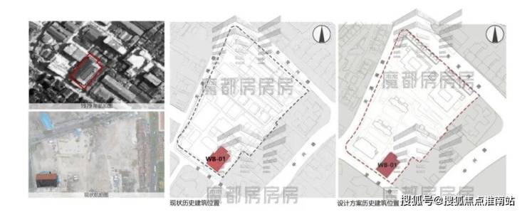 项目地块形状为不规则梯行,南北方向较长,将用地分成南北两部分,其中北侧布置商办组团及历史建筑,南侧布置住宅组团及综合配套(文保点)。