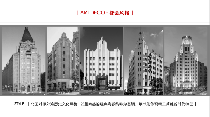 首先是建筑风格方面,项目致敬万国建筑博览群,采用ART-DECO摩登艺术风格。