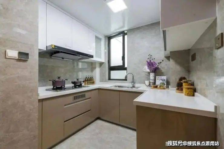 U型厨房设计,扩大厨房的空间视野,把洗涤区、操作台、烹饪区划分为三个区域,功能明确,根据拿、洗、切、炒动线的合理布局,让烹饪步骤一气呵成。