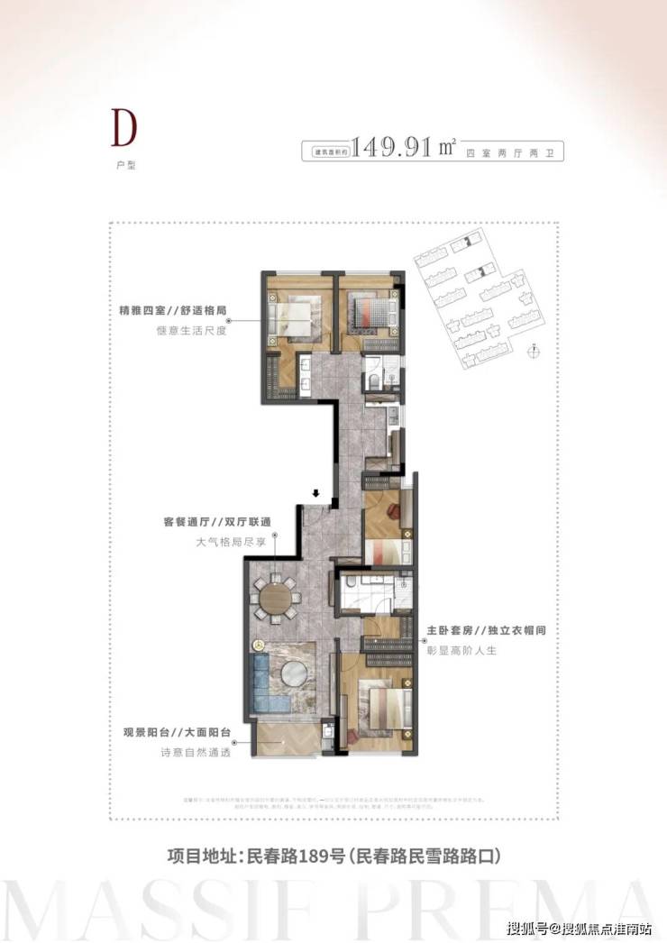 项目共有4个主力户型,包括建筑面积约114㎡3室2厅2卫,约130㎡4室2厅2卫,约149㎡4室2厅2卫,约161㎡4室2厅2卫。