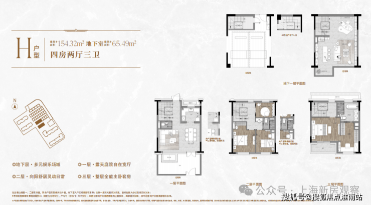 风貌别墅:建面约131-154㎡的联排产品,地上3层+地下1层,附赠庭院、露台及地下室,实际使用面积超200㎡,仅32席,稀缺性强 。