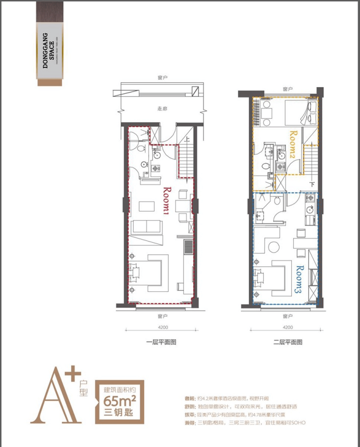 层高4.78米,面宽则达到4.2米,这个数据需要比较,市面上的同类产品,这个层高已经不多,面宽则很少超过4米。加上双面采光的单廊设计,空间感就很好了。
