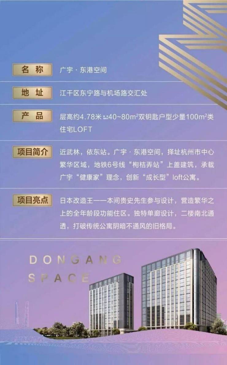 最新价格及项目卖点详情:东港空间位于杭州上城区城东新城板块,售楼处地址为上城江干区全福桥路423号东港空间展示中心。在售户型建面约48-96㎡,均价约29000-35000元/㎡,总价约140万起,物业费5元+1元能耗费/㎡·月,备案名广宇东港空间,别名东宁公馆,现房交付。地铁6号线枸桔弄站上盖,1站直达火车东站;毗邻西子国际、汇和城及在建大润发,核心卖点:4.78米层高双钥匙LOFT、单廊双向采光、地铁上盖现房、不限购不限贷。