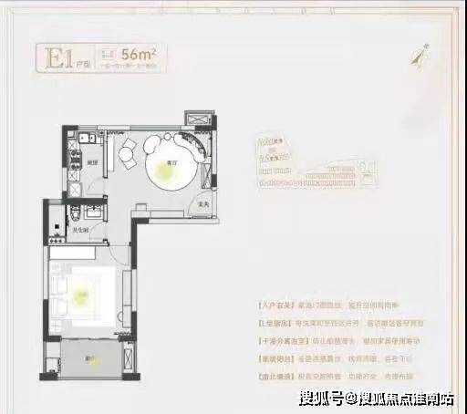 建面约55㎡1房1卫户型,低总价优质上车小户型,做到了双开间朝南+卫生间干湿分离+卧室带飘窗+客餐厅相连,小而美的一个户型。