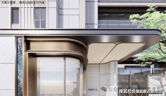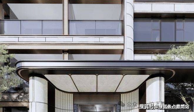 在楼栋主入口同样运用石材+弧形铝板等元素,同时还有格栅装饰,质感提升明显: