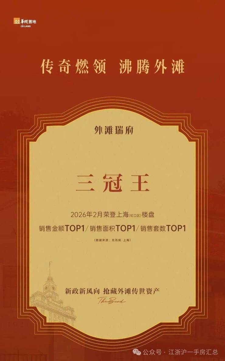 这是项目官方发布的海报,外滩瑞府荣膺2026年2月虹口区新房三冠王。