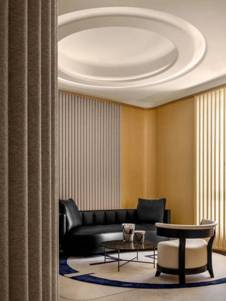 进入会所空间的步道中,蜿蜒曲折的墙面,犹如黄浦江江面,视觉上的无限延伸,不止是在简单诉说曲线的优美,更像是一场与陆家嘴澎湃城市气象的对话。