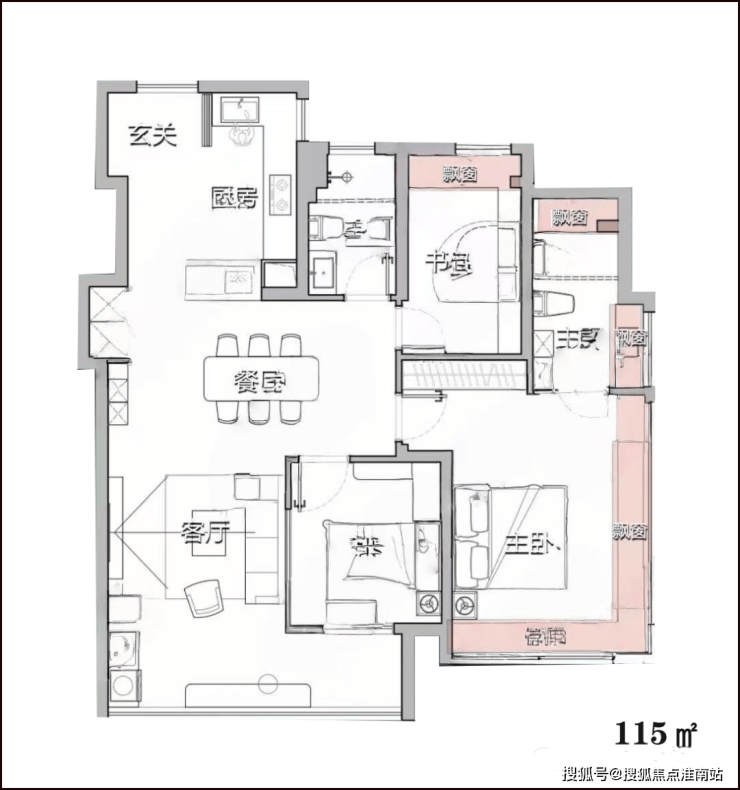 在这次翡雲悦府的最大户型升级里,就是做到了非常夸张的「赠送面积比」,户型图上红色部分都是不计入建筑面积的区域,三面全飘窗带来了完全不同的居住体验。