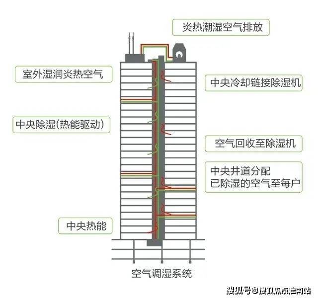 除湿原理:室外高湿的空气被送风机吸入新风机组,遇到新风机组里的冷盘管(冷盘管里的7℃冷水,来源于中央能源系统的冰蓄冷系统),高湿空气的水分子被稀释出来,冷凝水滴到积水盘,再通过排水管排出去,留存下来的就是低温干燥的空气,送入室内。