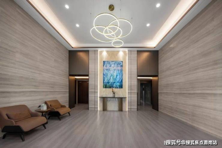 公区设计上,览月阁同样是高奢酒店风。地上单元门厅高挑大气,艺术吊顶+超大现代艺术灯+大幅岩板,加上各类材料的艺术化运用,同步星级酒店的高级生活体验。