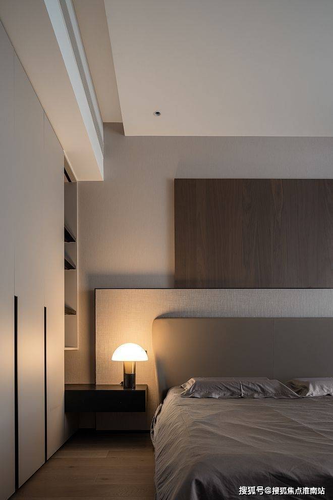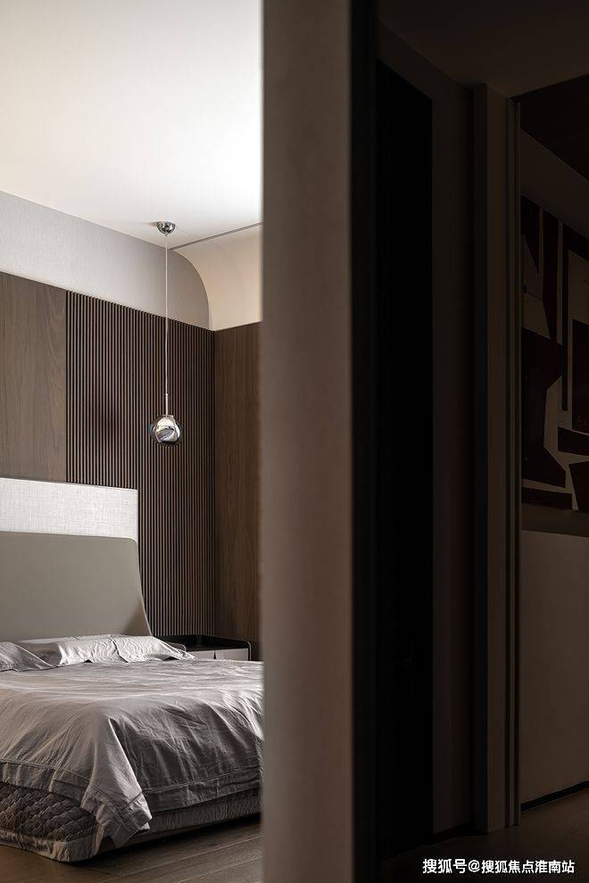 精心塑造床头背景墙的层次美感,将纹理与肌理的变幻巧妙融合,搭配具有治愈力量的光源,二者相互辉映,共同烘托出静谧且高雅的空间格调。不同层面的美在此汇聚,恰到好处地滋养着精神世界。
