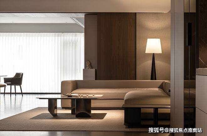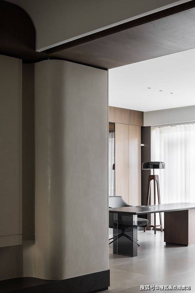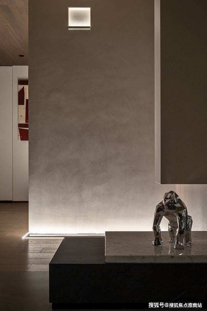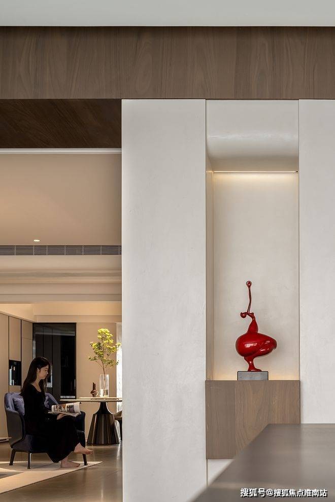色彩过渡自然清晰,借由光线巧妙强化踢脚线,清晰梳理客餐厅与过道间的内在逻辑关联。转折的体块设计融入镂空元素,与素雅温润质感相呼应,共同谱写出诗意的空间韵律。