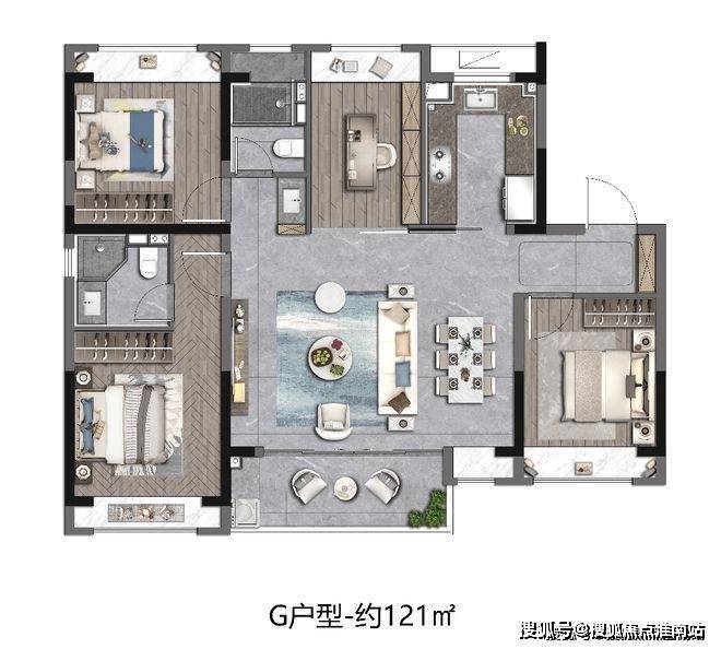 建面约121㎡ 4房2厅2卫,宽境4房,拓宽空间尺度;大开间、进深短,通透采光;主卧独立卫浴,优雅随心的寝居感受。