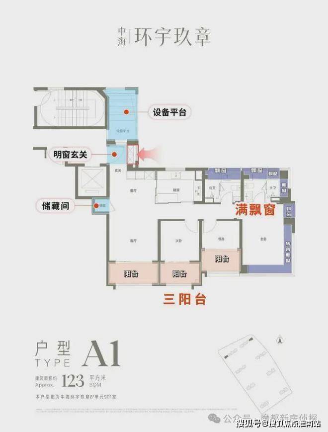 建面约123㎡的户型,做了南向三个阳台,碾压常规的一个阳台/双阳台户型。并且阳台买1得2,飘窗全赠送。