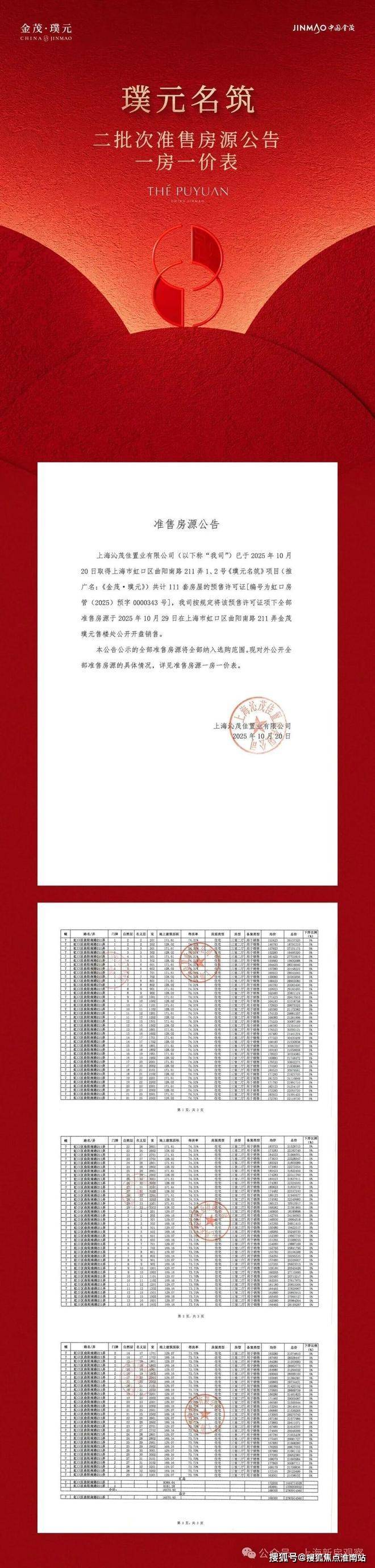 最新消息!上海2025年首个地王“瑞虹地王”金茂+庆隆瑞虹项目正式定名「金茂·璞元」 首开售罄!三期建面约200㎡4房;均价16.81万/m²,总价2800-3670万!一梯一户,得房率82-85%,高隐私、空间感强;售楼处线上火热预约中!